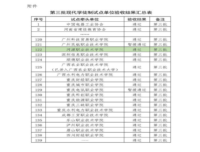 近日,教育部网站发布了《关于公布现代学徒制第三批试点验收结果的通知》(教职成司函〔2021〕40号),确定178家试点单位通过验收,河源职业技术学院(以下简称“河职院”)在2018年8月获批为教育部第三批现代学徒制试点院校,经过河职院、鸿客集团河源客天下的共同努力下,顺利通过验收。