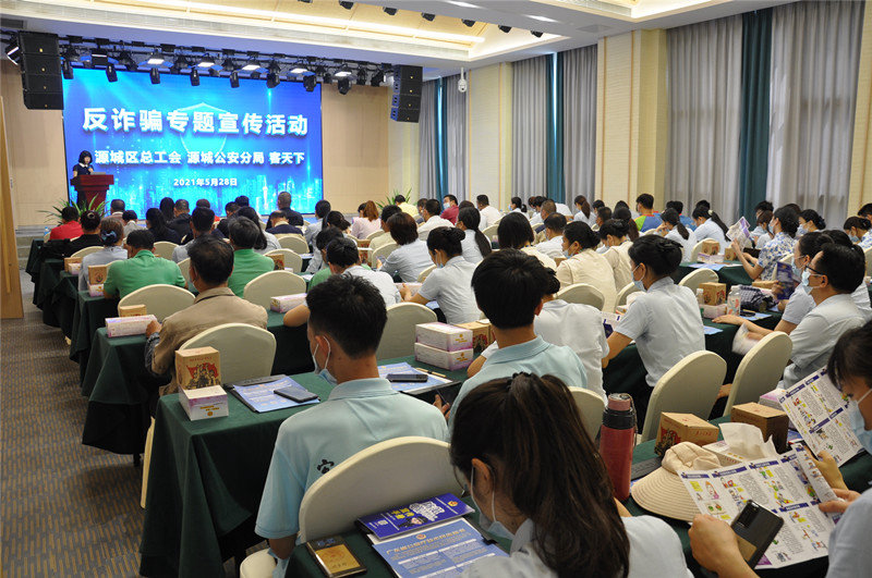 为遏制电信网络诈骗犯罪多发高发态势,切实加强防范电信网络诈骗宣传,提高公司职工群众防范各类电信诈骗的安全意识,减少电信诈骗案件的发生及避免财产损失,5月28日上午,源城区总工会、源城公安分局高埔岗派出所联合鸿客集团在河源客天下国际大酒店二楼会议室开展反诈骗专题宣传活动。源城区总工会党组成员、副主席刘丹莉,源城公安分局高埔岗派出所副所长李奕文,鸿客集团总裁助理张小山、河源客天下各部门负责人及会员出席了本次活动。